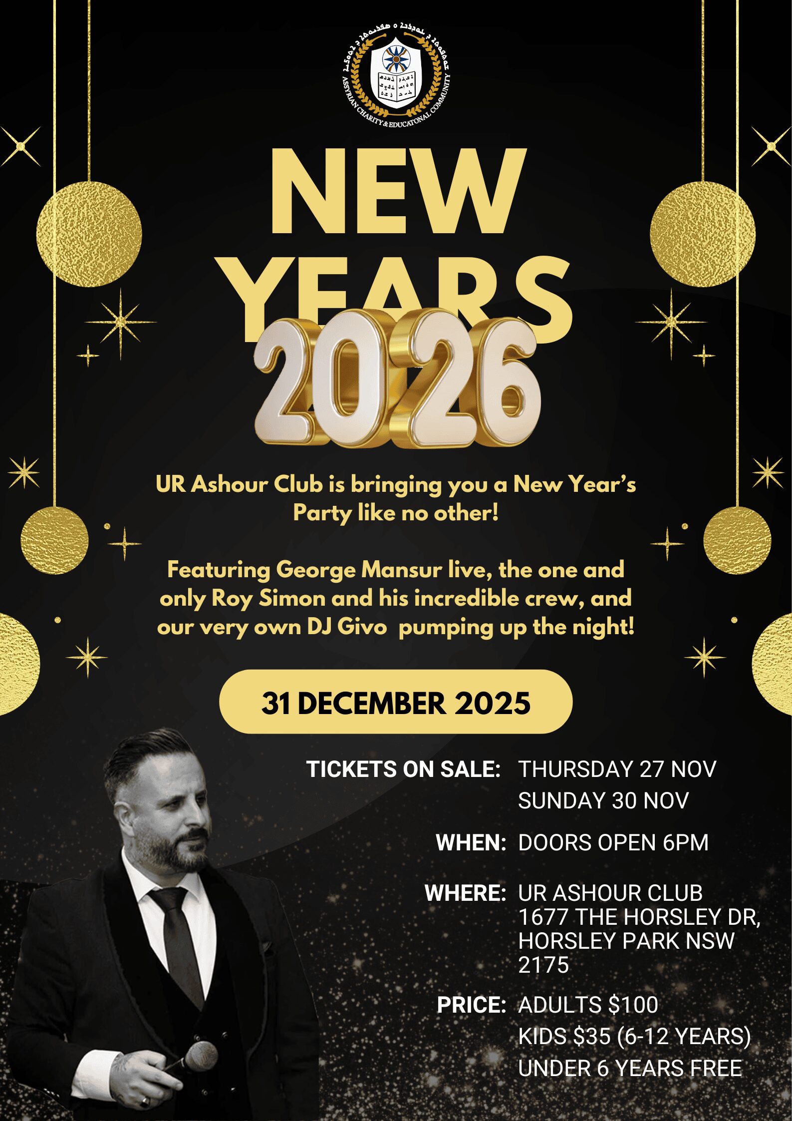 Ur Ashour Club is hosting a New Year’s Party like no other — featuring George Mansur live, the one and only Roy Simon and his incredible crew, and our very own DJ Givo Abdishou bringing the energy all night long!